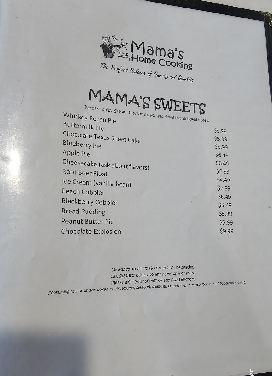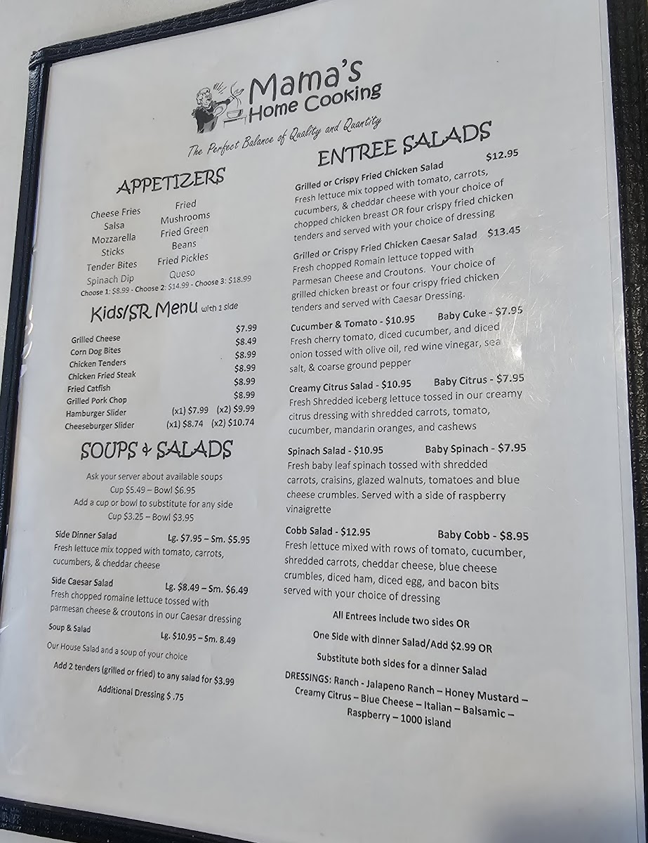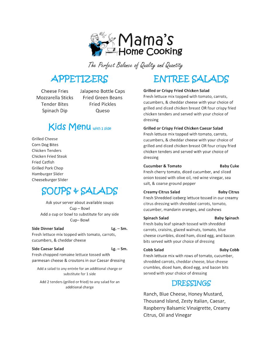 At Mama's Home Cooking Menu, you’ll find a warm and inviting selection of home-cooked comfort food, perfect for any occasion. Whether you're craving classic Southern dishes or hearty family favorites, this menu has something for everyone. From savory, tender fried chicken to creamy mashed potatoes and rich gravy, every bite brings a sense of nostalgia and satisfaction. The daily specials offer even more variety, with rotating options that ensure something new to try each time you visit. Add a side of freshly baked cornbread, and you’ve got a meal that feels just like home. Whether you’re stopping by for a quick bite or enjoying a leisurely meal with loved ones, Mama’s offers the kind of food that makes you feel cared for with every bite.